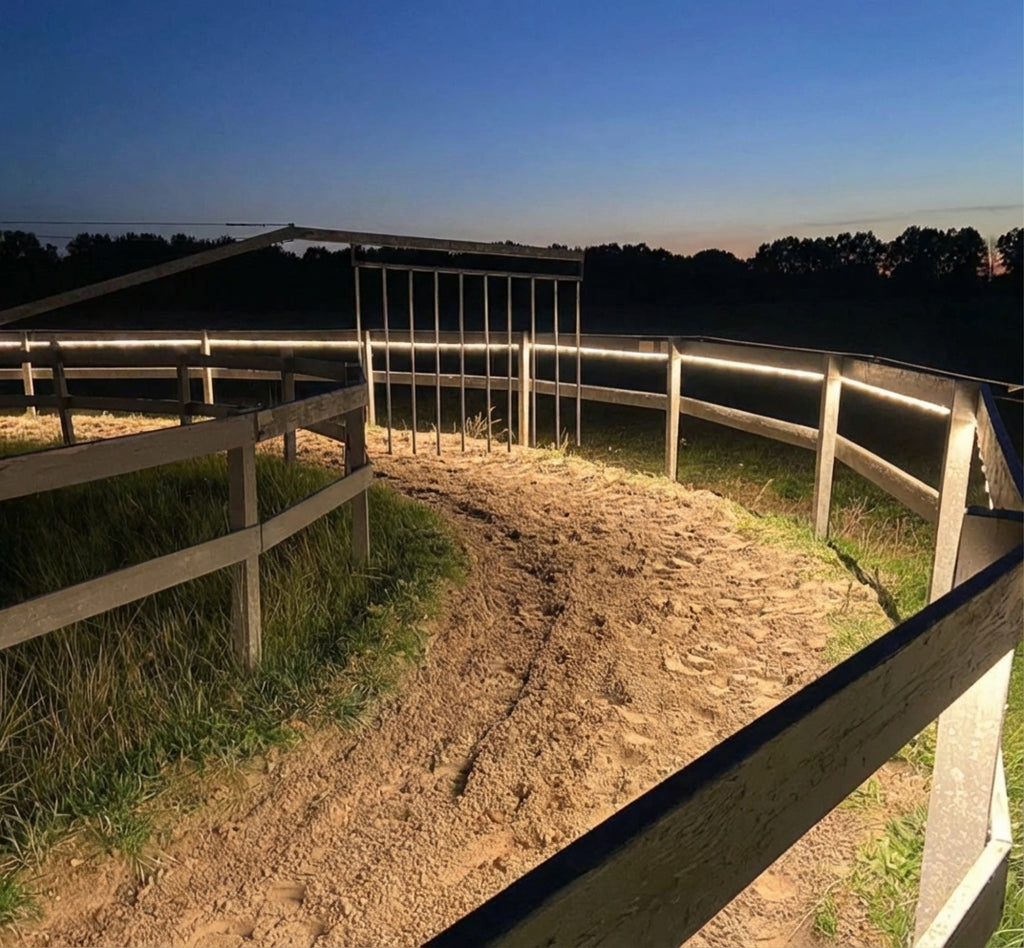 De lichtslang combineert een robuuste constructie met maximale flexibiliteit. Hang hem strak langs het hek, volg bochten of rol hem uit over langere stukken – hij past zich eenvoudig aan iedere rijbak of stalruimte aan.