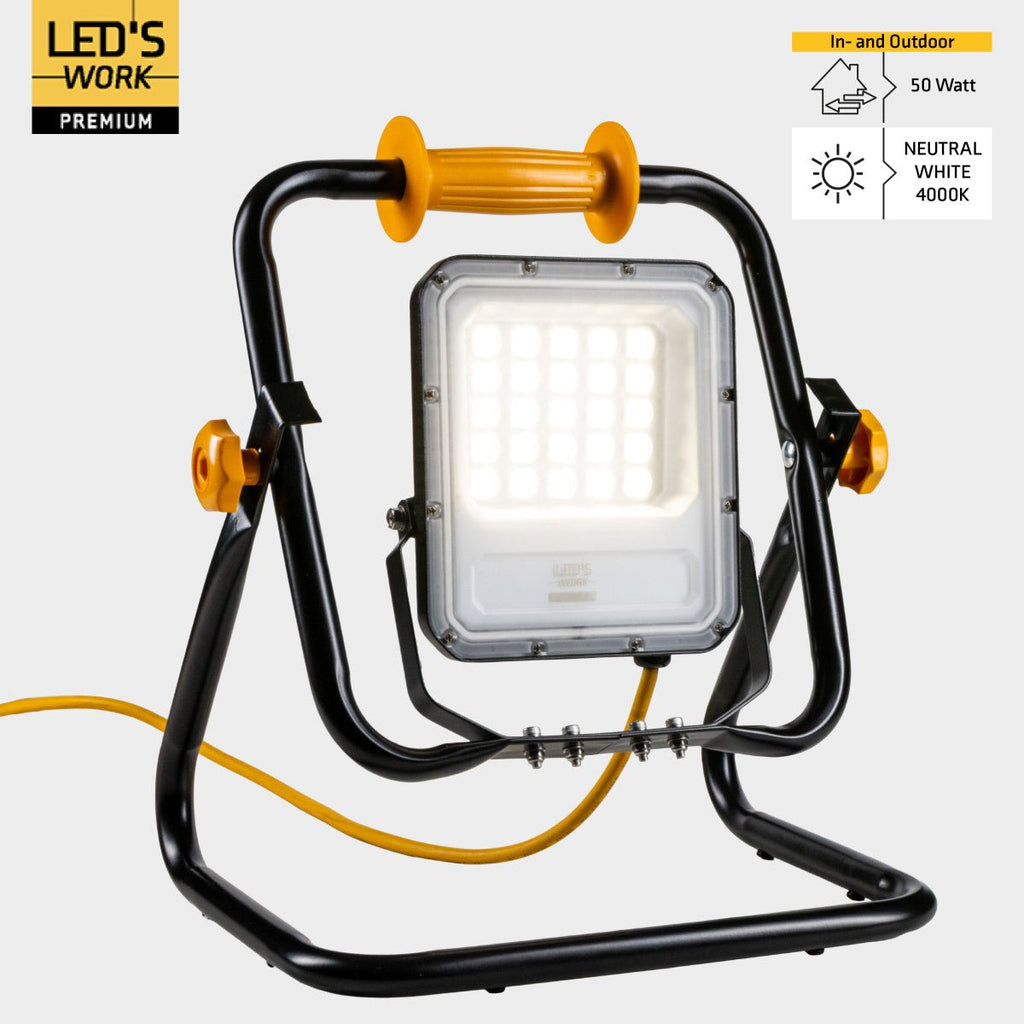 De LED’S WORK PREMIUM bouwlamp is een robuuste, energiezuinige werklamp die speciaal is ontworpen voor professioneel gebruik. Dankzij de sterke aluminium behuizing, slagvaste diffuser en IP65-bescherming is deze lamp bestand tegen stof, water en schokken. De gele accenten en het 5 meter lange gele snoer zorgen voor extra zichtbaarheid en veiligheid op de werkplaats.